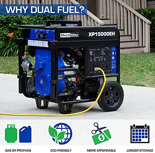 DuroMax XP15000EH Dual Fuel Portable Generator-15000 Watt Gas or Propane Powered Electric Start-Home Back Up & RV Ready, 50 State Approved, Blue and Black