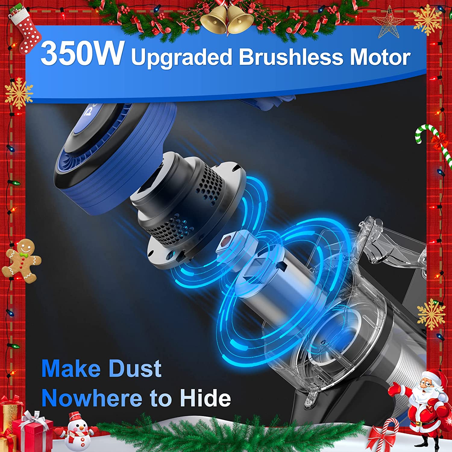 【 Powerful Suction & Deep Cleaning】With a 350W super-strong advanced brushless motor, the cordless vacuum cleaners generate up to 26000Pa powerful suction while remaining in a relatively silent environment. Designed with two suction modes to meet a variety of cleaning needs: on standard mode, the cordless vacuum performs well on tile, marble, and wood floors, while in Max Power mode, the stick vacuum is able to effectively clean short pile carpets, pet hair, and larger particles like cereal, cat litter, and dust.