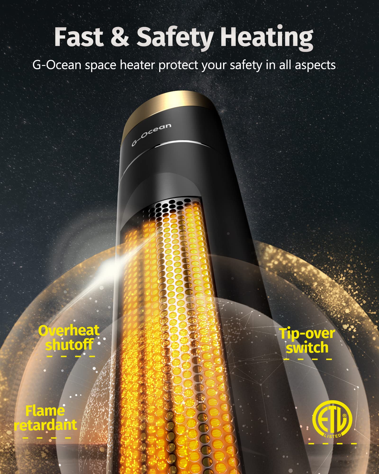 GET SAFE PRODUCT – Worried about damaging electric circuits or starting a fire? Relax! The over-heating & 45°over-tip protection promise this safe tower heater shut off automatically, once it overheats or is knocked down by children or pets. As soon as you have this heater, You can completely discard these concerns. ETL listed, G-Ocean space heater will offer all the consumers 1-Year manufacture with your purchase. Feel free to contact us at any time.