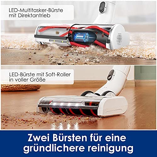 Der PURE ONE S12 Pro EX wird mit zwei LED-Powerbürsten für unterschiedliche Bodentypen geliefert. Die direktbetriebene LED-Multi-Tasker-Powerbürste dringt tief in die Fasern ein, um Schmutz aus jedem Teppich zu entfernen. Die weiche LED-Soft-Roller-Powerbürste schützt harte Böden vor Kratzspuren während es feinen Staub und Schotter entfernt.