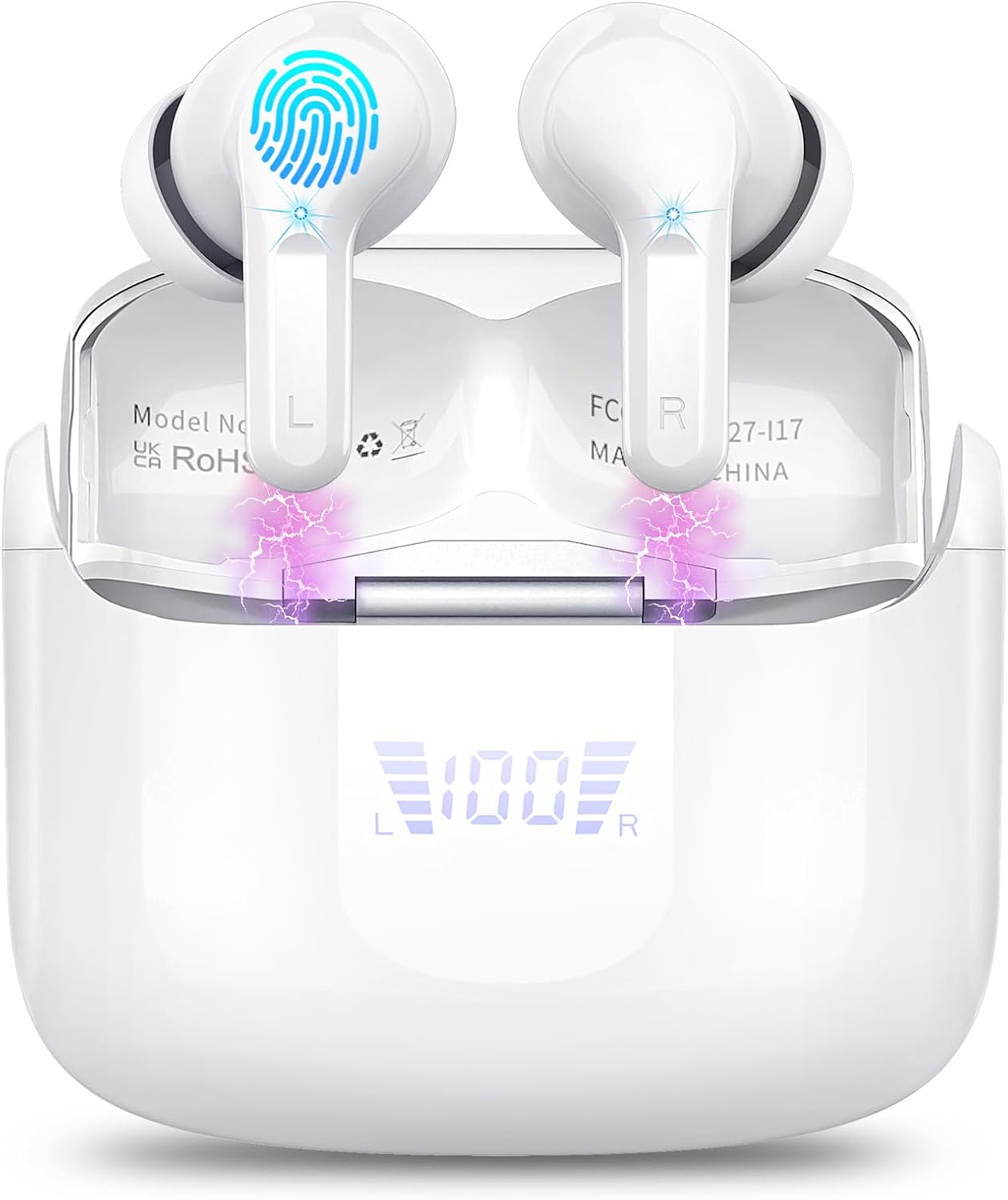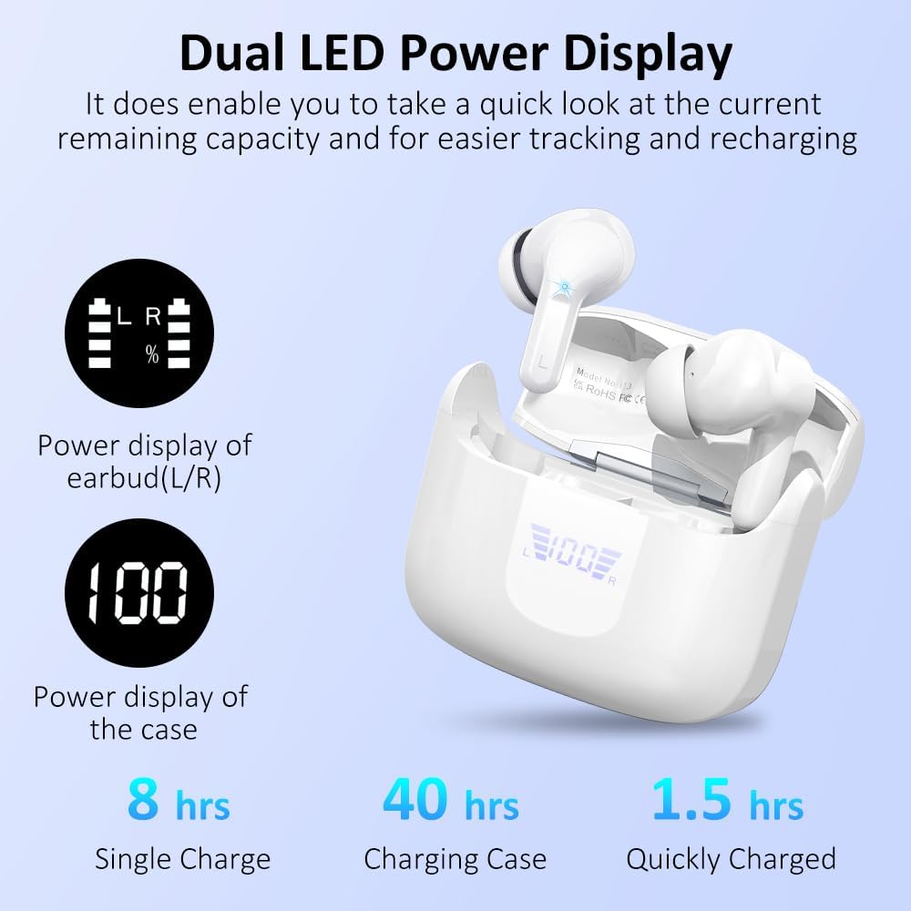 Wireless Earbuds, Bluetooth 5.3 Headphones in Ear with 4 ENC Noise Cancelling Mic, HiFi Stereo Deep Bass Wireless Earphones 40H Playtime, in-Ear Earbud Bluetooth Dual LED Display IP7 Waterproof, White